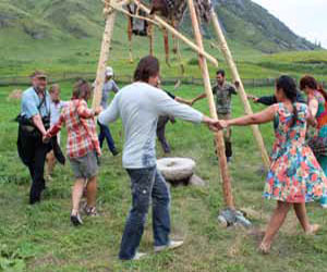 А во время вечернего отдыха участники устраивали маленькие концерты. Звучали комуз и, привезённая художницей Мариной Громовой, индийская флейта, издающая нежные звуки от движения рук танцующего. Им помогал звонкий дабыл – кожаный барабан, изготовленный местным мастером Байгожи Жакияровым. Под аккомпанемент флейты Димы Зайцева и гитары Александра Мещерякова пели песни, читали стихи.
